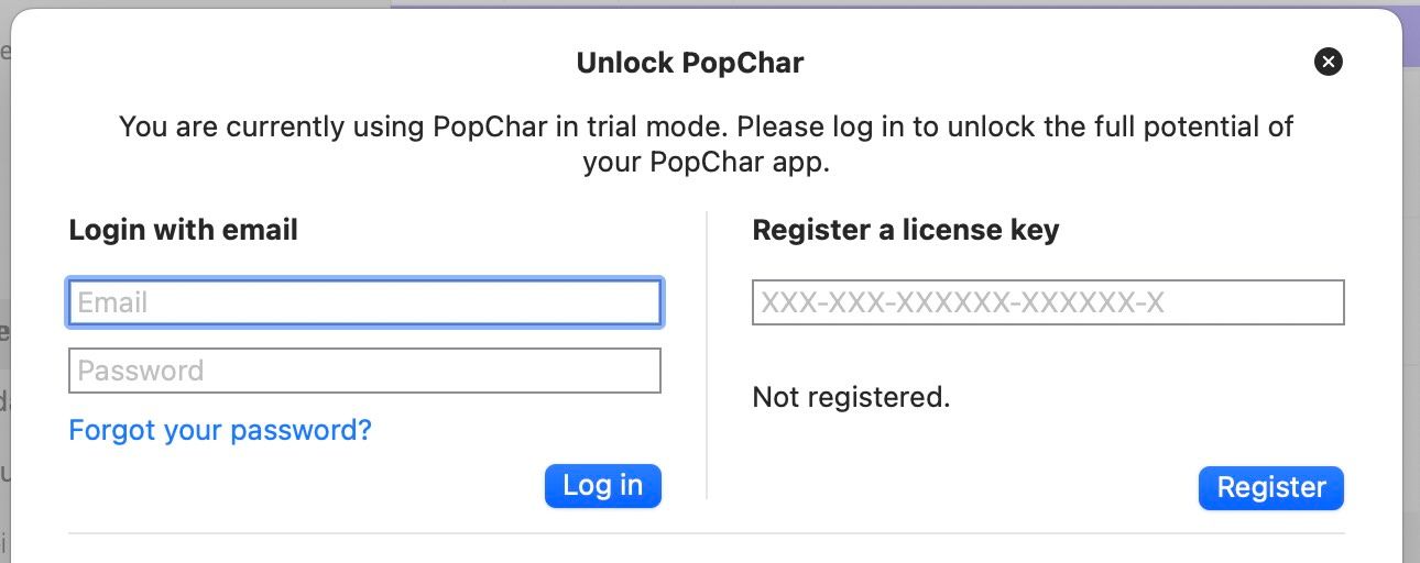 If you bought PopChar before version 10.3 you have received a traditional license key instead of our new login based system right after your purchase. This key is still valid so please go ahead with the following steps: